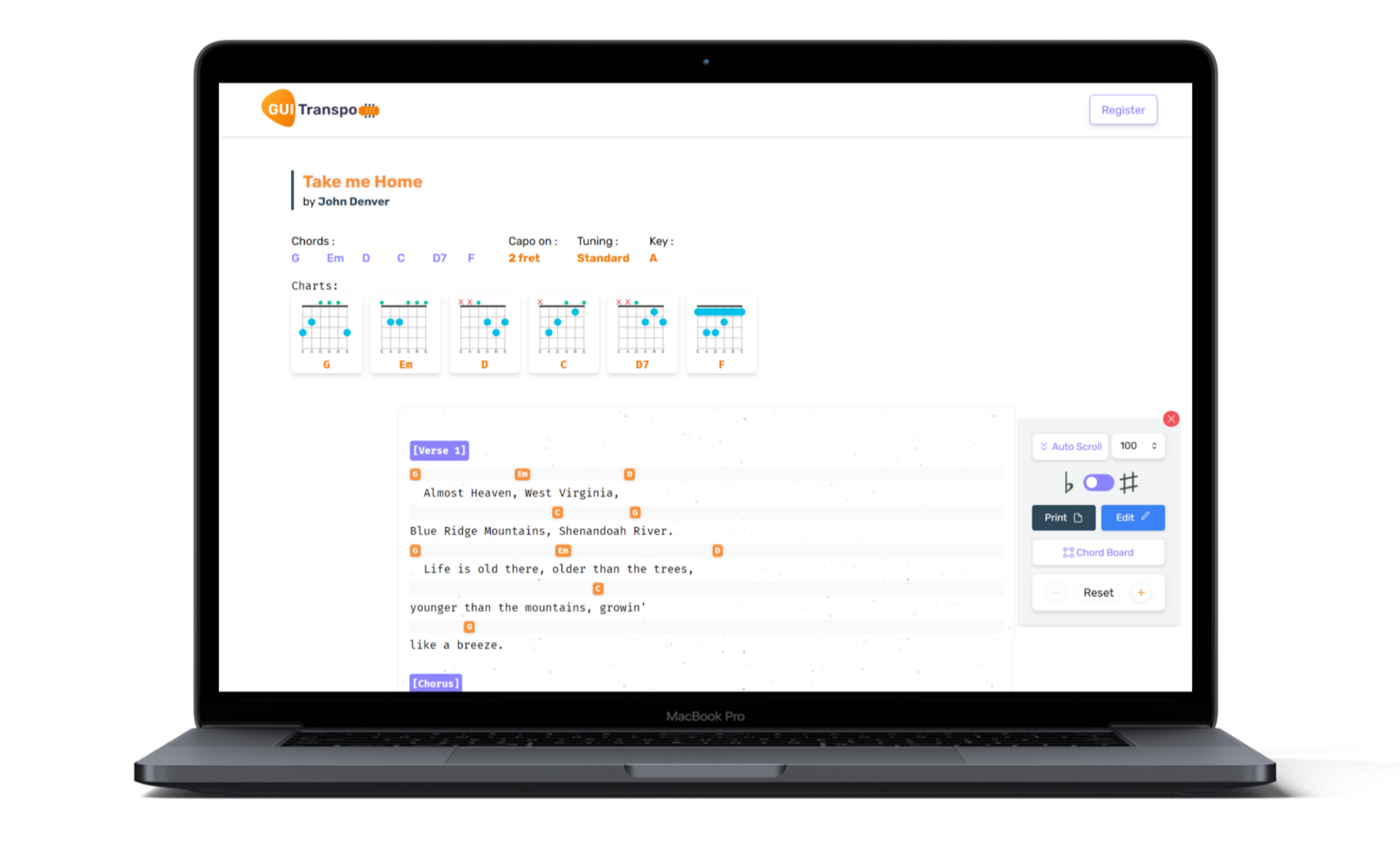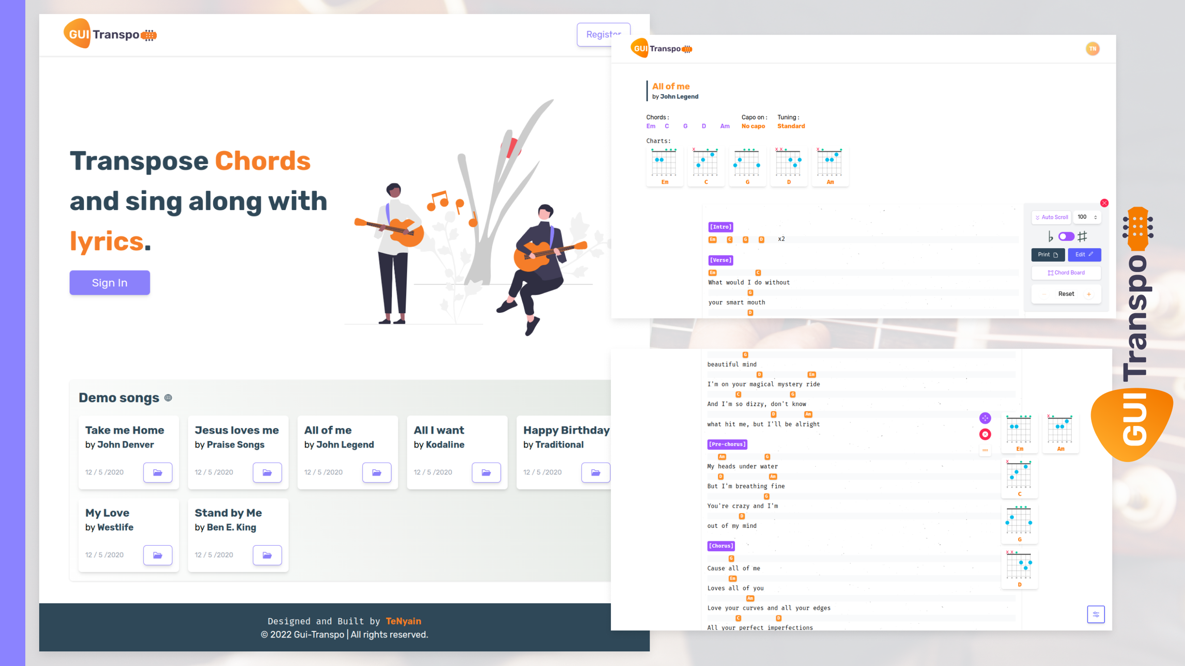 Are you a newbie guitarist or a composer? Sometimes we have to manage a song to customize matching our vocal range or find a perfect version of a song to play with a guitar. Gui-Transpo is a place to generate or customize guitar chords and lyrics with storing the data so that you can access it and sing along with it.